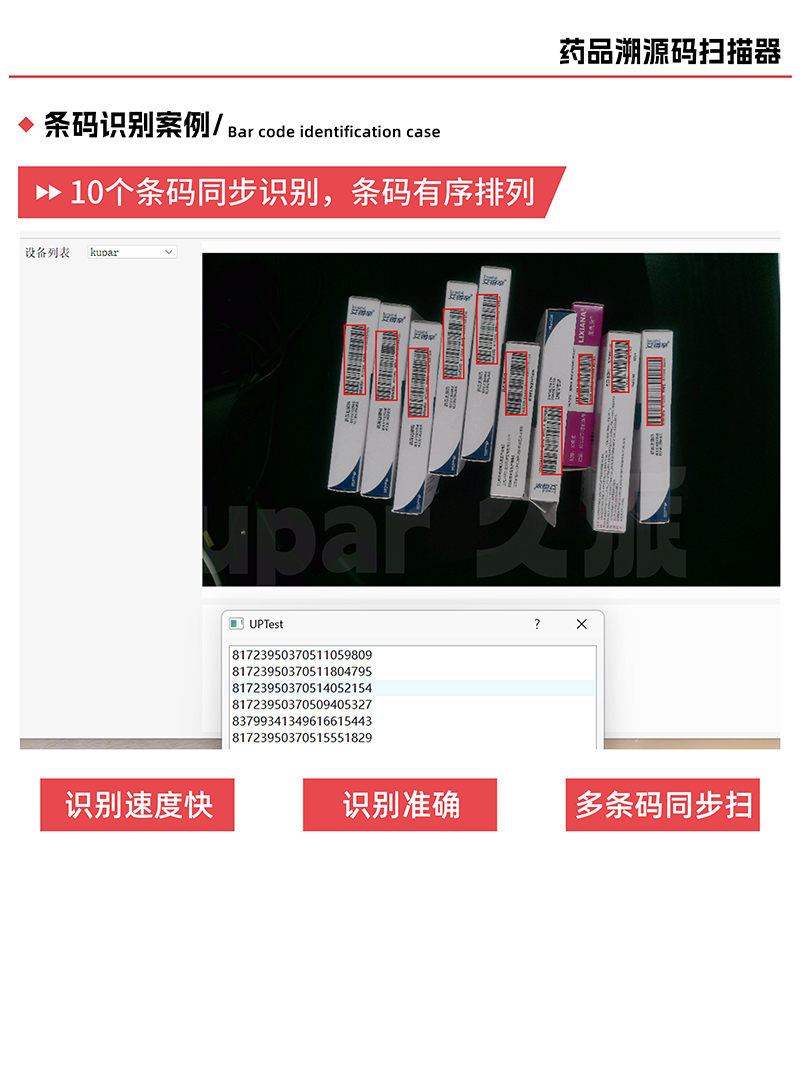 采用工業(yè)掃碼方案將先進的解碼算法和圖像識別技術(shù)集成,支持最大單次掃描30個盒藥品,可實現(xiàn)精準(zhǔn)識別藥品追溯碼、藥